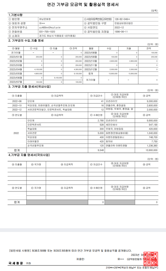 하남문화원 2022 기부금모금액 및 활용실적명세서 공개