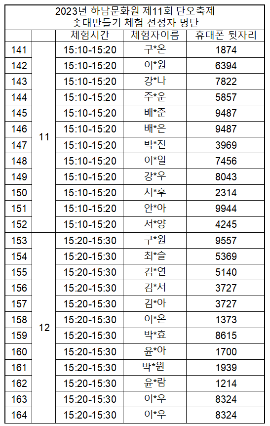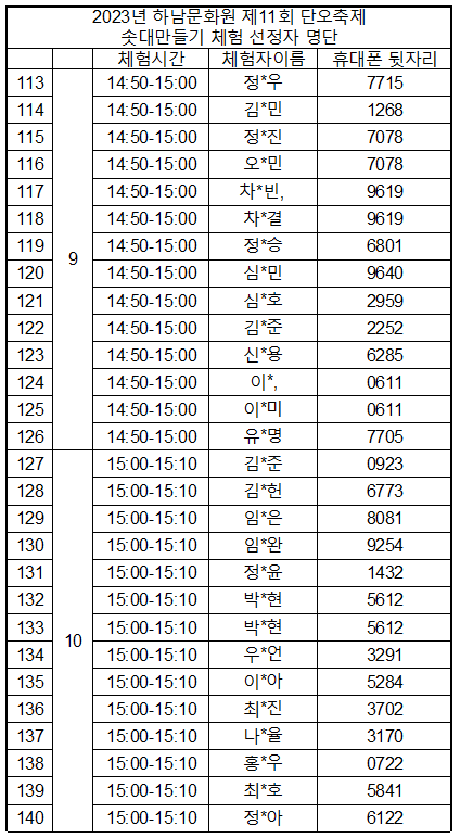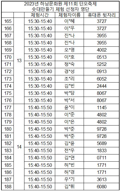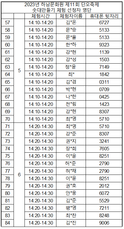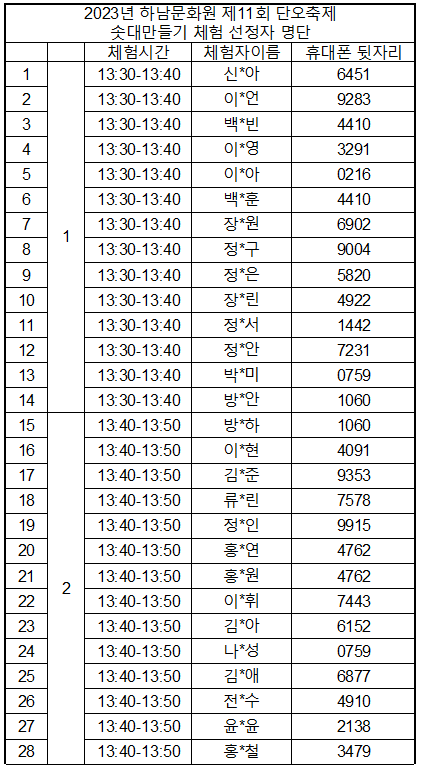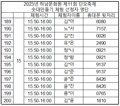 사전 신청 기간 중 특정 시간대에 신청 인원이 집중되어 부득이하게 체험시간이 임의 조정 되었습니다. 원활한 체험 진행을 위한 시간을 나누어 배정한 점 양해 바랍니다.