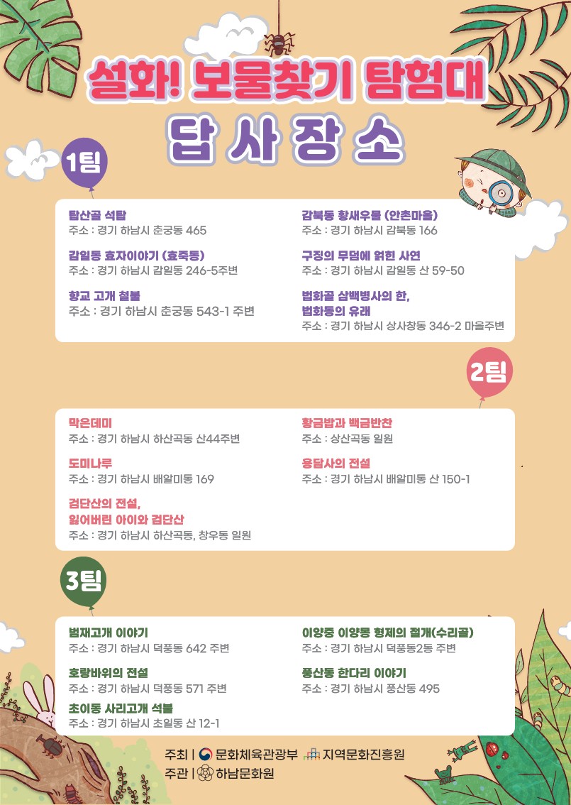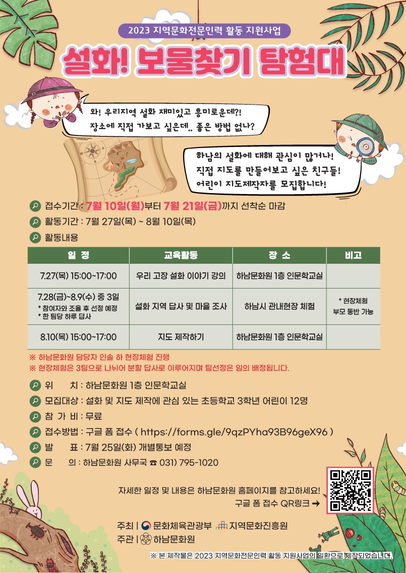 하남문화원은 향토사 교육의 일환으로 여름방학동안 관내 초등학교 3학년을 대상으로 우리고장 설화지도 제작하고 설화가 탄생된 장소를 현장 체험학습할 [설화! 보물찾기 탐험대]를 모집합니다.