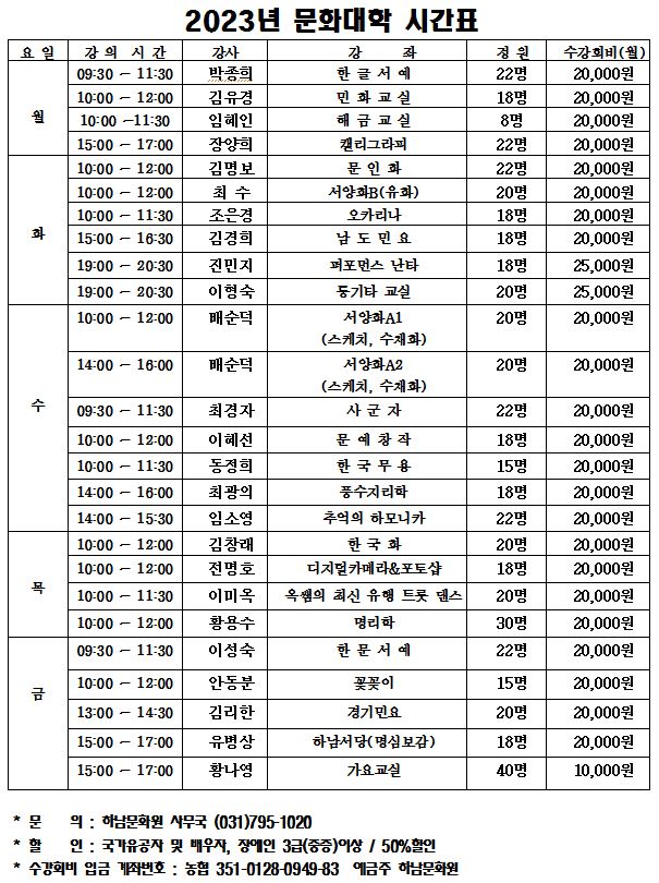2023.09.11 조회수 : 2927하남문화대학 2023년 4분기(10월~11월)