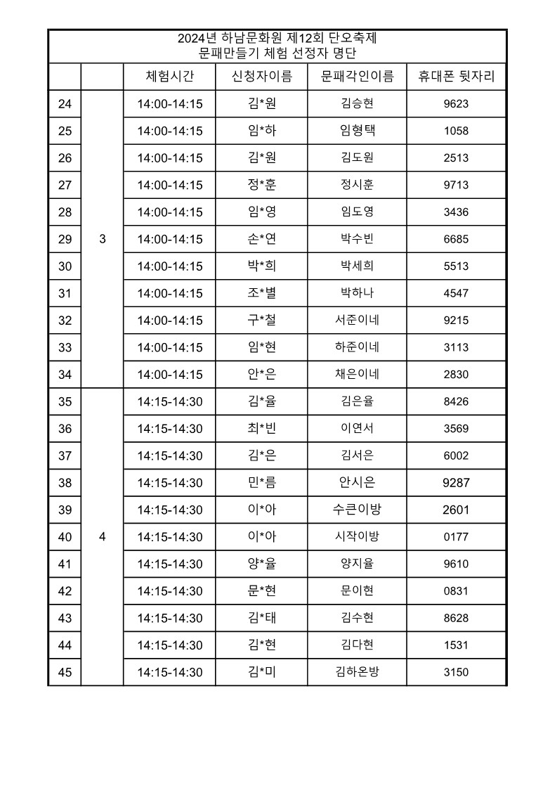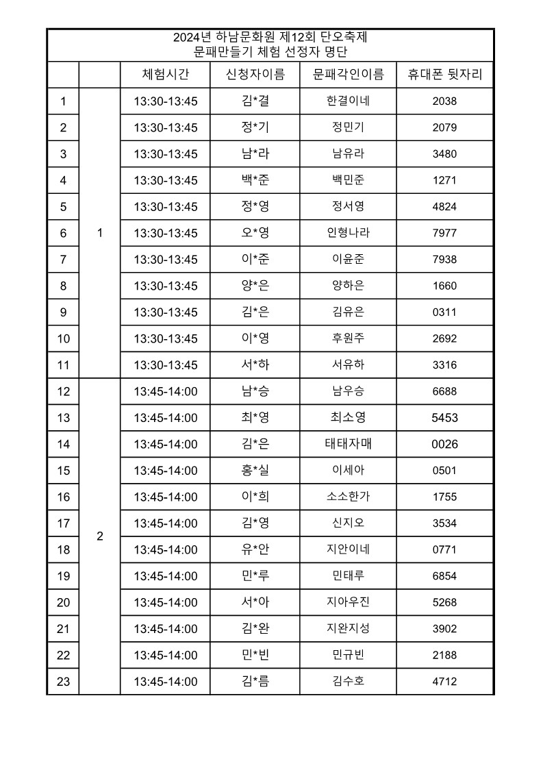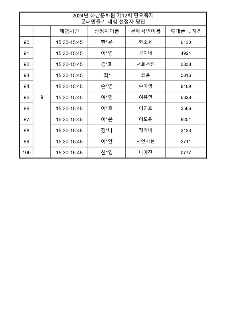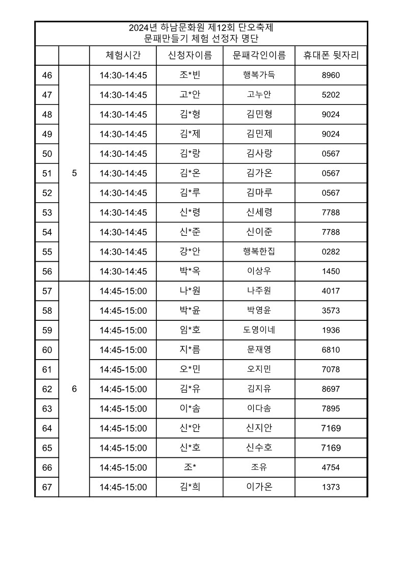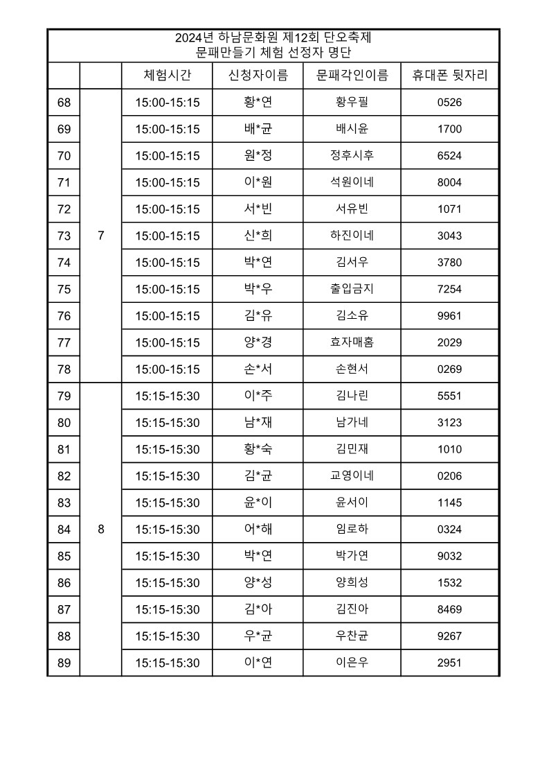 문패 만들기 선정자 명단을 게시 하오니