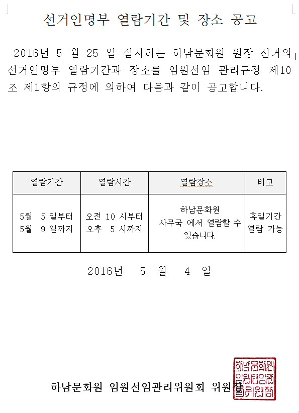 2016년 4월 13일(수) 하남문화원 휴관안내
