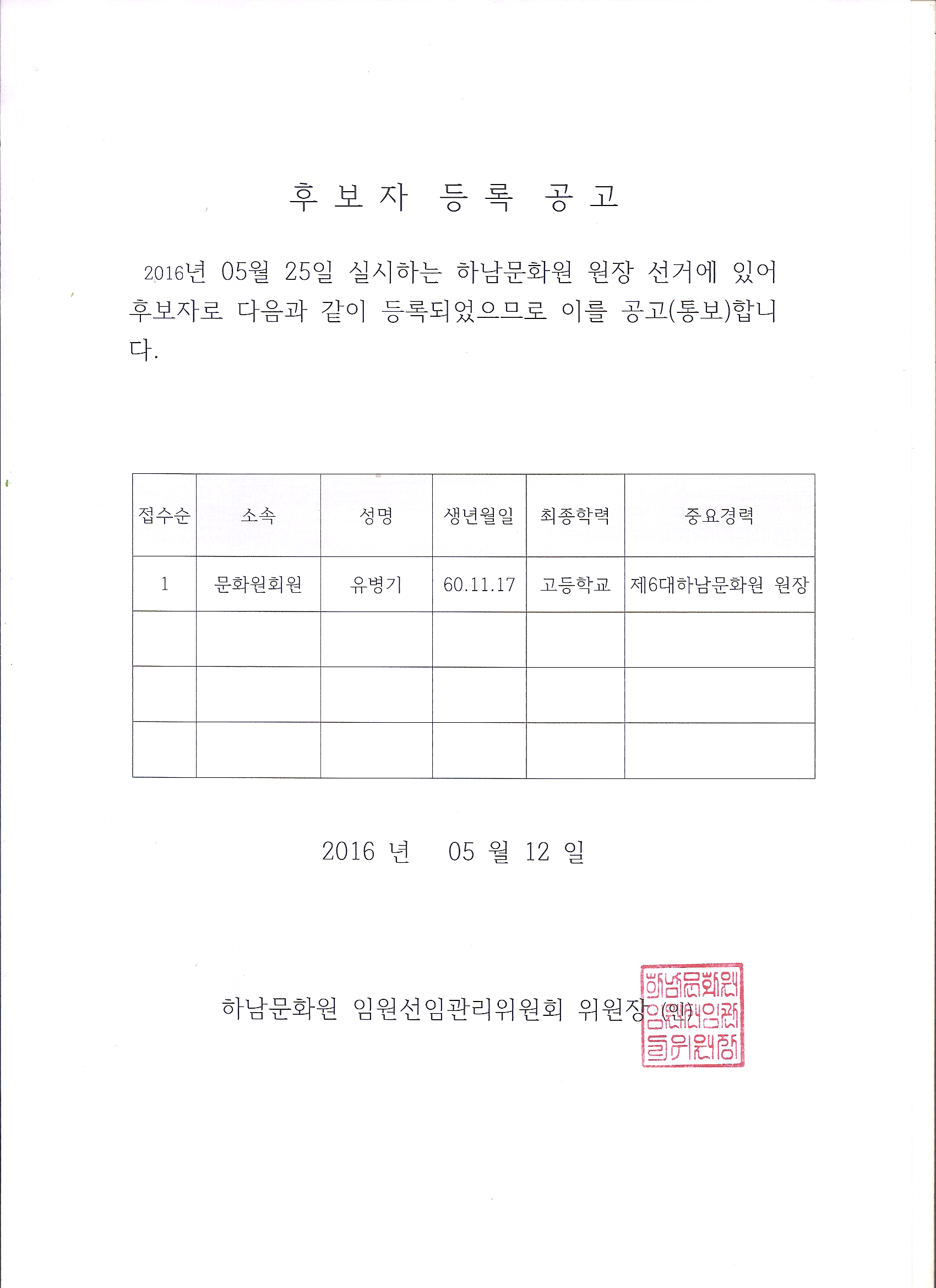 하남문화원 7대 원장 선거 후보자 등록 공고