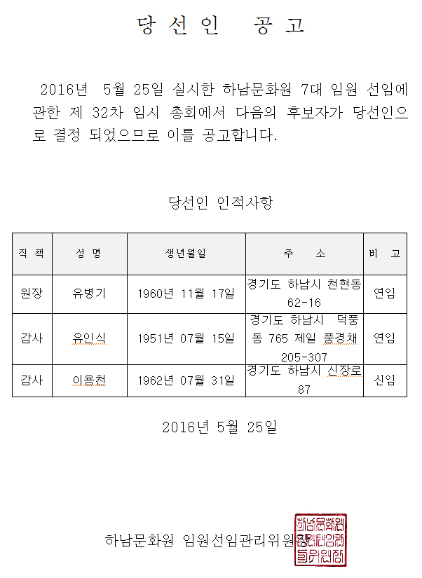 하남문화원 7대 원장 선거 후보자 등록 공고
