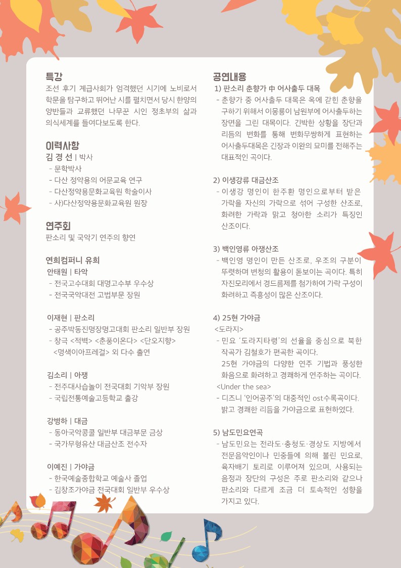 - 타악, 판소리, 아쟁, 대금, 가야금의 연주