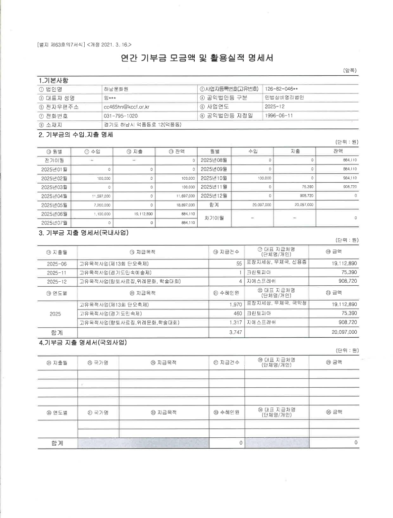하남문화원 2026 기부금모금액 및 활용실적명세서 공개